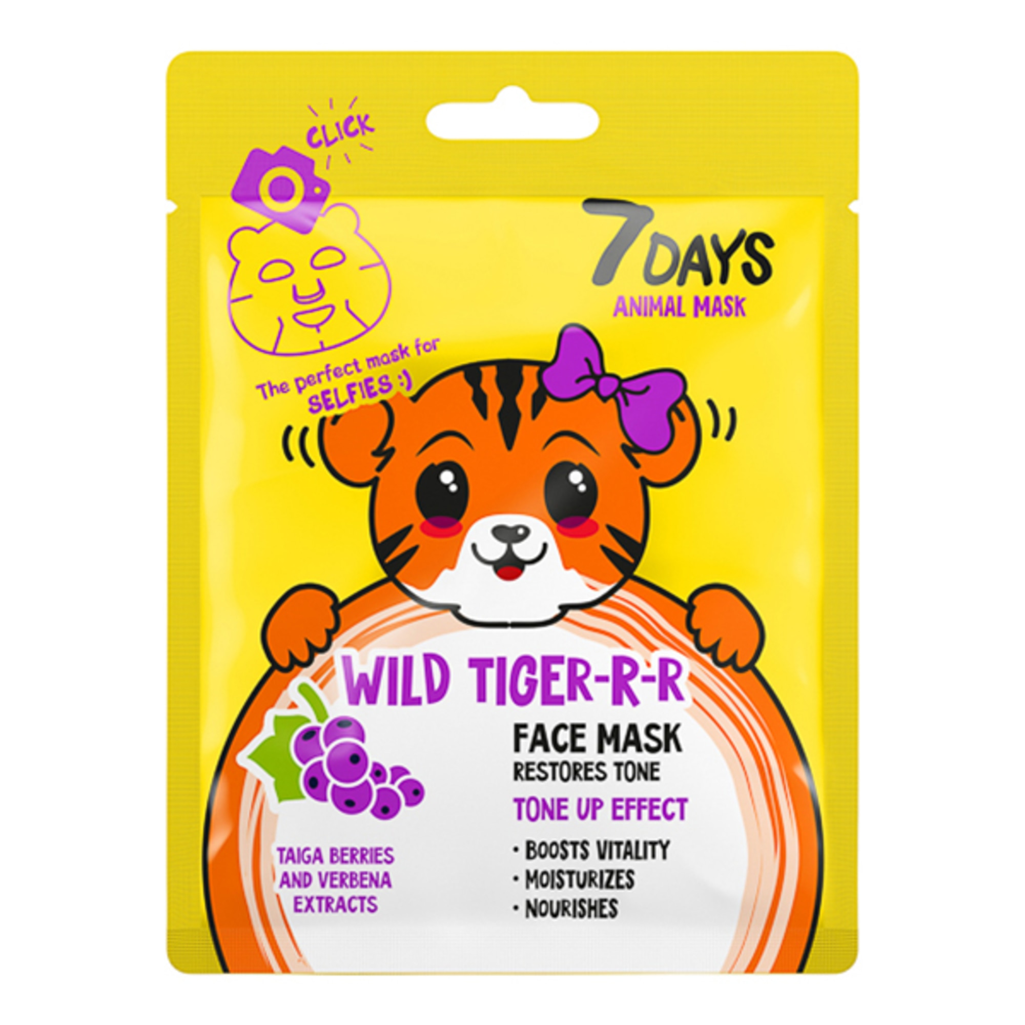 Cura perfetta della pelle + contenuti per i social media = Maschere ANIMAL! Ogni maschera ha la forma di un simpatico animaletto e un complesso di principi attivi per la cura della pelle. Come una tigre selvaggia, questa maschera ti regala forza e resistenza. L'estratto di bacche di Taiga ha potenti proprietà tonificanti ed energizzanti, mentre la Verbena elimina i segni della stanchezza e regala al viso morbidezza e un'incarnato uniforme, levigato e luminoso. La sua azione rapida permette di vedere risultati reali in soli 20 minuti. Questa maschera vi darà la carica!
