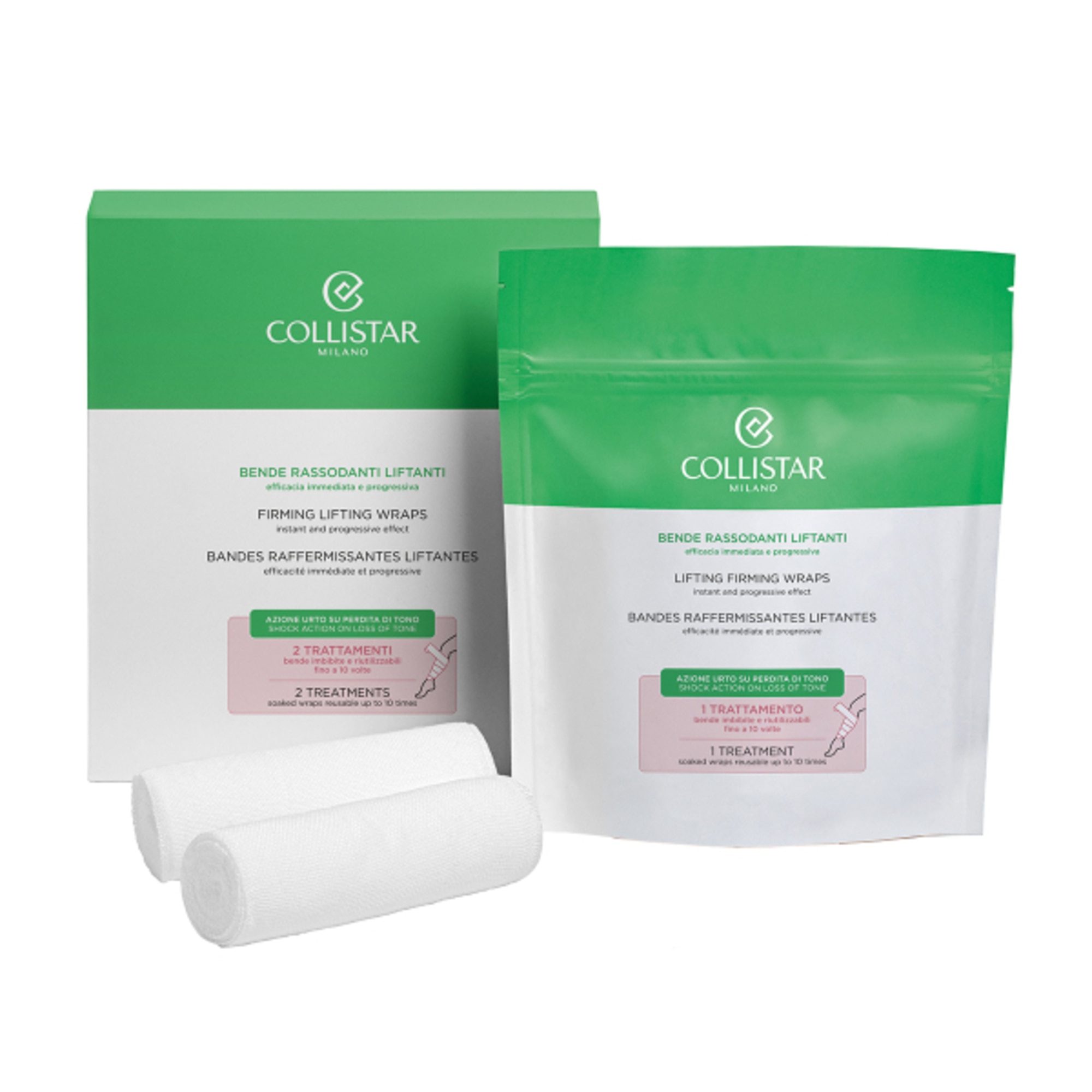 IL KIT CONTIENE: • 1 busta “apri e chiudi” contenente 2 Bende già imbibite e pronte all’uso, lavabili e riutilizzabili fino a 10 volte ciascuna • 1 busta refill monodose da 100 ml di Soluzione Rassodante Liftante per un’altra sessione di trattamento.