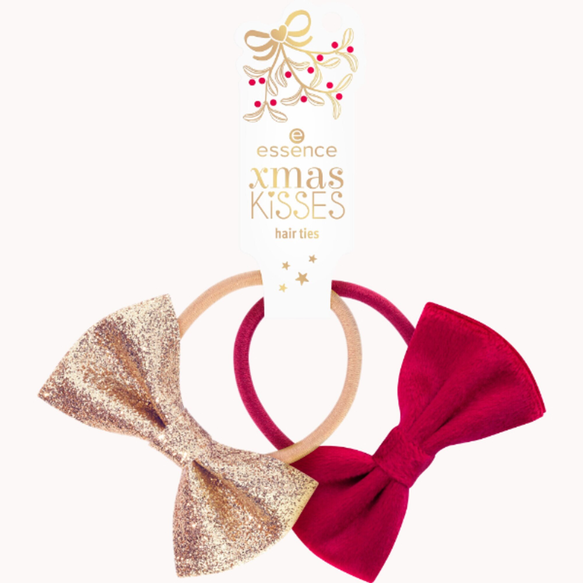Prepara i tuoi capelli al Natale con gli elastici essence xmas KiSSES 01 Mistletoe’s Bow, Kiss Below! Il set include due elastici per capelli con un grazioso fiocco – uno in morbido velluto rosso, l’altro dorato con glitter. L’elastico trattiene i capelli in posizione per tutto il giorno, aggiungendo un dettaglio festoso al tuo outfit natalizio.