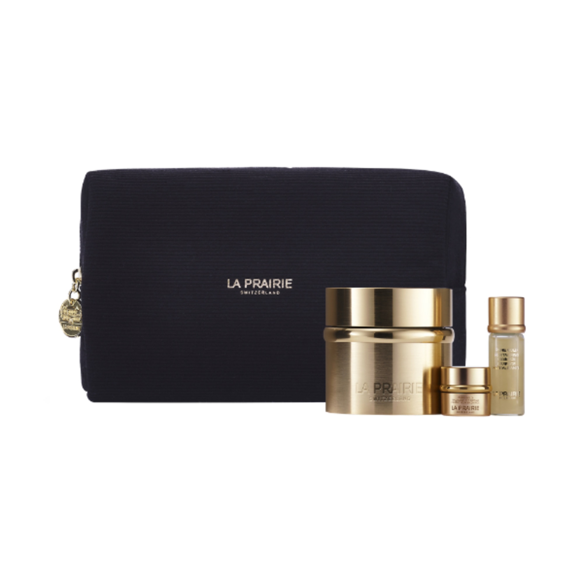 4. Pouch a coste nera in velluto con logo La Prairie oro. Eleganza senza tempo in ogni dettaglio.
