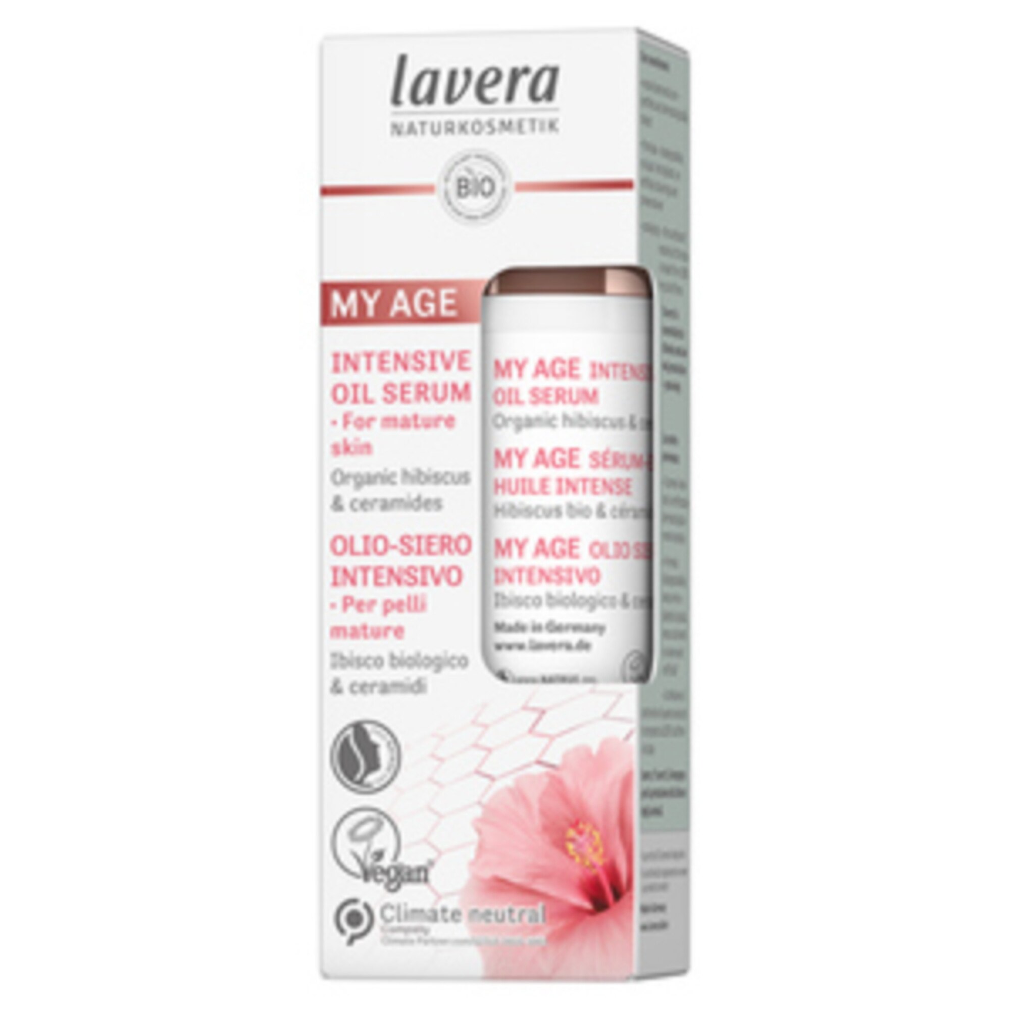Scoprite il segreto lavera di un trattamento viso prezioso per la pelle matura. La nuovissima linea Anti Age é stata accuratamente formulata bilanciando Ibisco biologico e ceramidi di origine vegetale. Questo siero ha una texture oleosa ma non ungente poiché si assorbe rapidamente e lascia la pelle profondamente nutrita.morbida ed elastica.