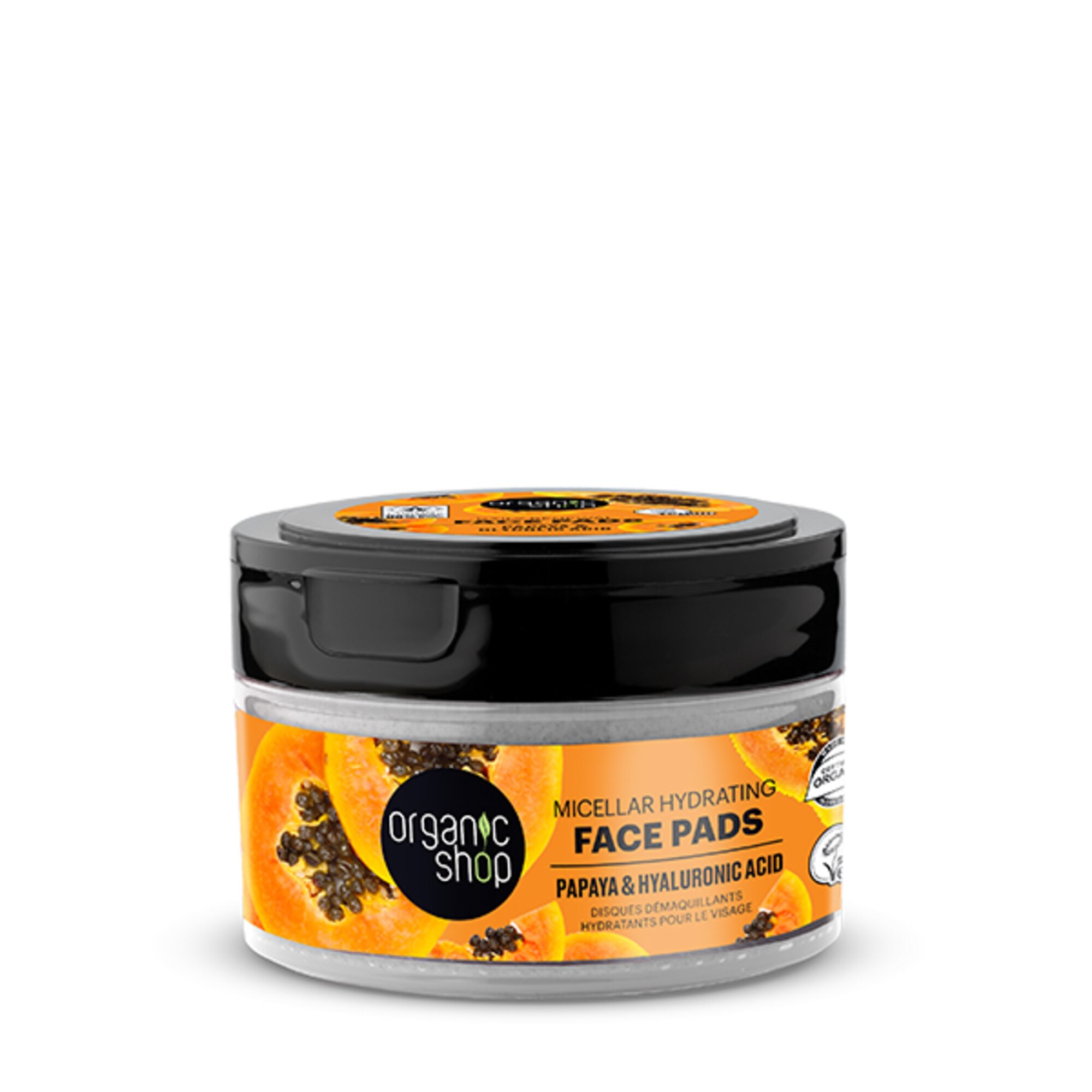 Questi Pads 2in1 in un solo passaggio detergono il viso e lo idratano. L’ESTRATTO DI PAPAYA BIOLOGICO, ricco di enzima naturale papaina, esfolia perfettamente la superficie della pelle per sostenerne il rinnovamento, uniformando il tono della pelle. L’ACIDO IALURONICO idrata la pelle e la rende vellutata.